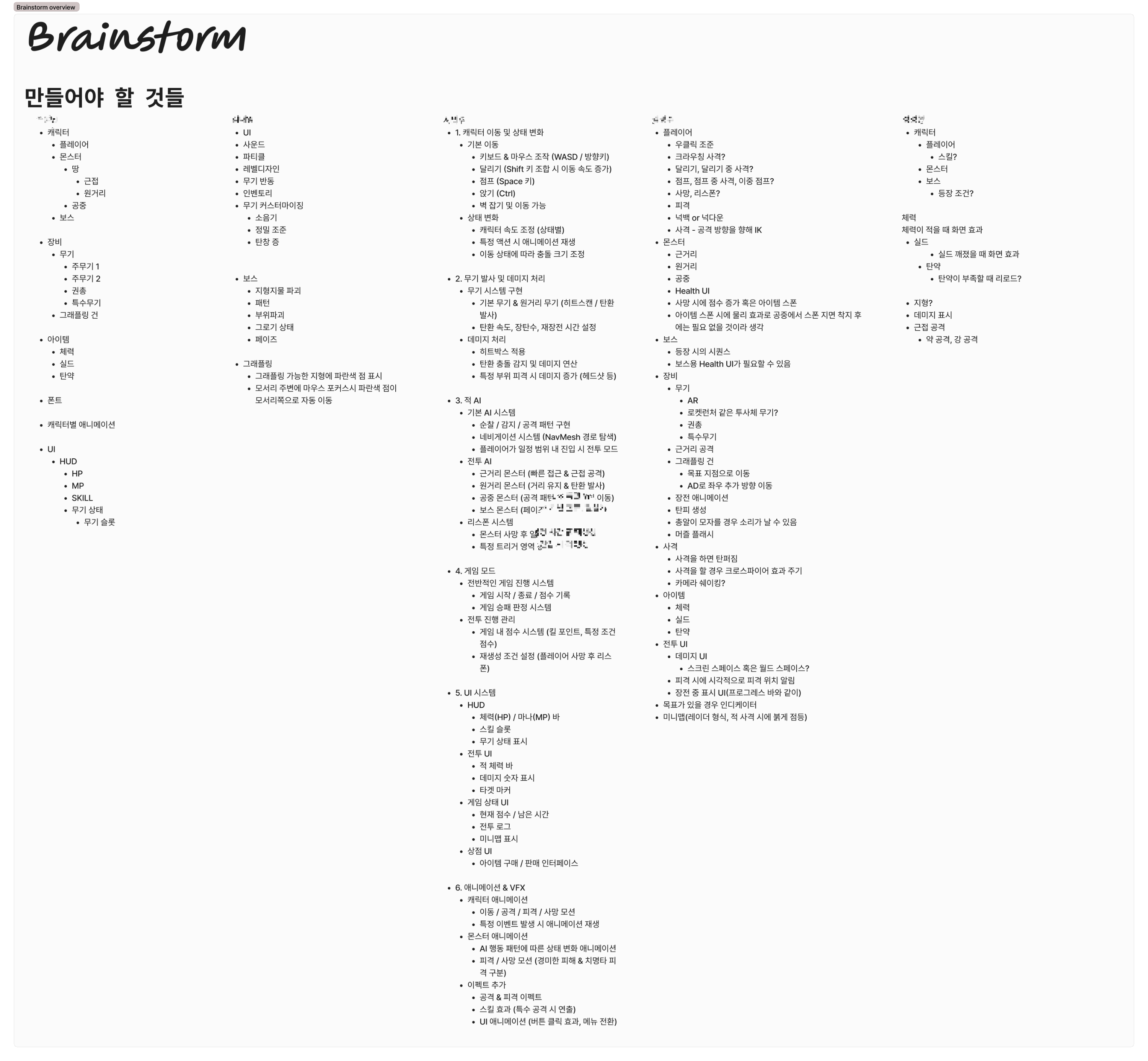 - 기획 세부 사항 다듬기(사용할 에셋 결정, 구현해야할 기능이 어떤게 필요한지 & 해당 기능 구현에 소요되는 시간 산정 및 필요한 지식 기록)