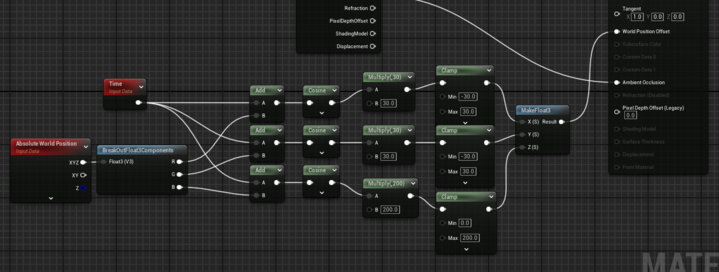 - 위의 실습 결과물에서는 나무의 원본 Material을 복제하여 아래와 같은 형태로 World Position Offset에 입력값을 전달하도록 수정했다.