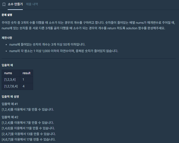 // 주어진 숫자 중 "3개의 수를 더했을 때" 소수가 되는 경우의 개수