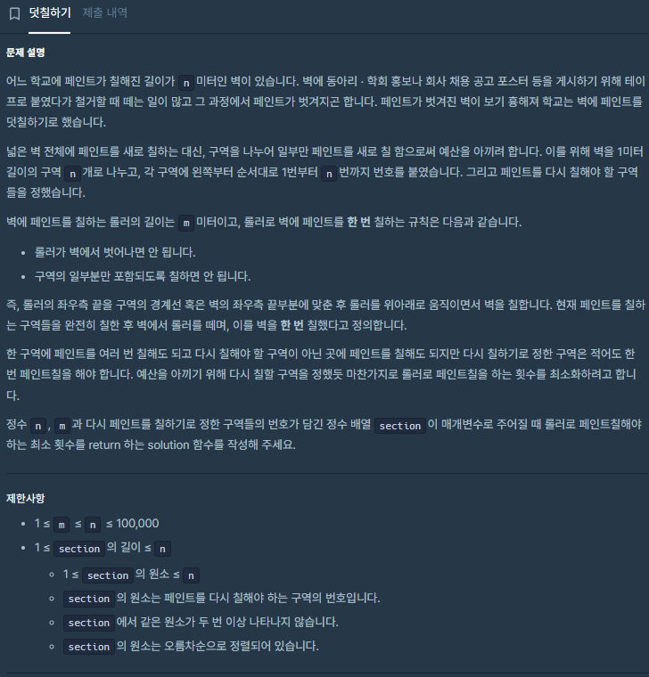- 정수 배열 section : 다시 페인트를 칠하기로 정한 구역들의 번호가 담겨있음.