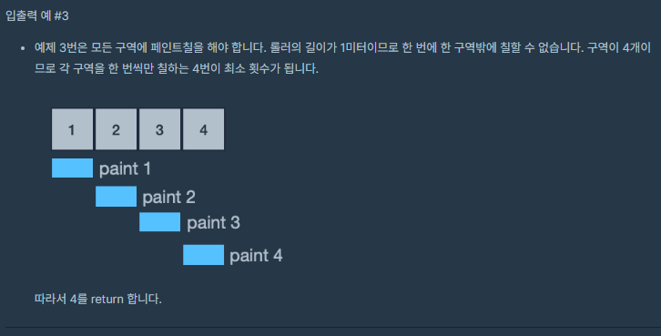 // 3. 한 구역에 페인트를 여러 번 칠해도 되고 다시 칠해야 할 구역이 아닌 곳에 페인트를 칠해도 되지만