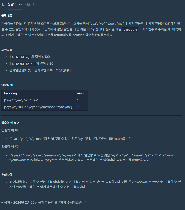 1. 반복문으로 babbling에 들어있는 문자열을 네 가지 발음 각각의 길이(2개, 3개)로 쪼개서(substr 활용) 할 수 있는 발음 문자열과 같은지 비교하고